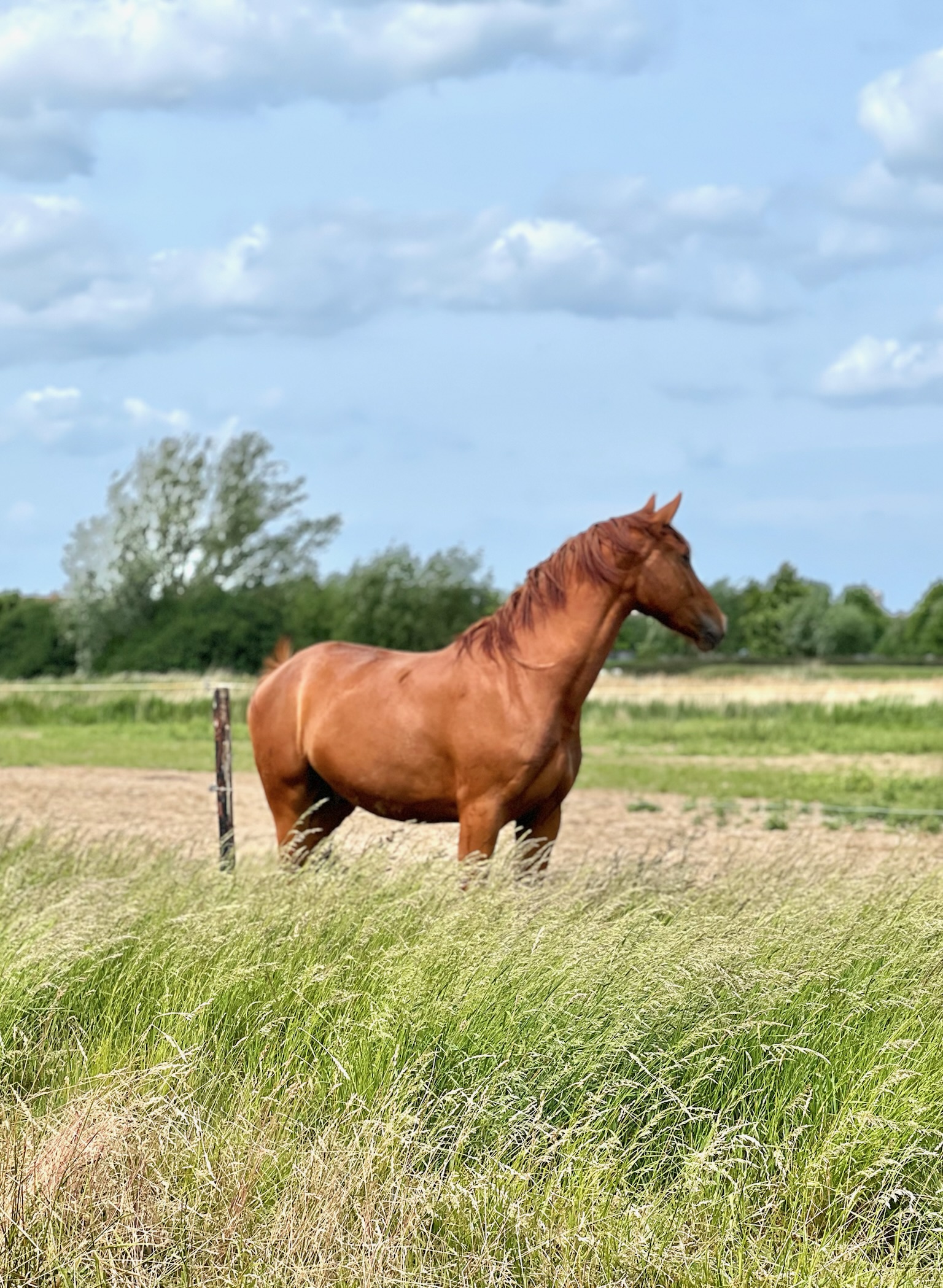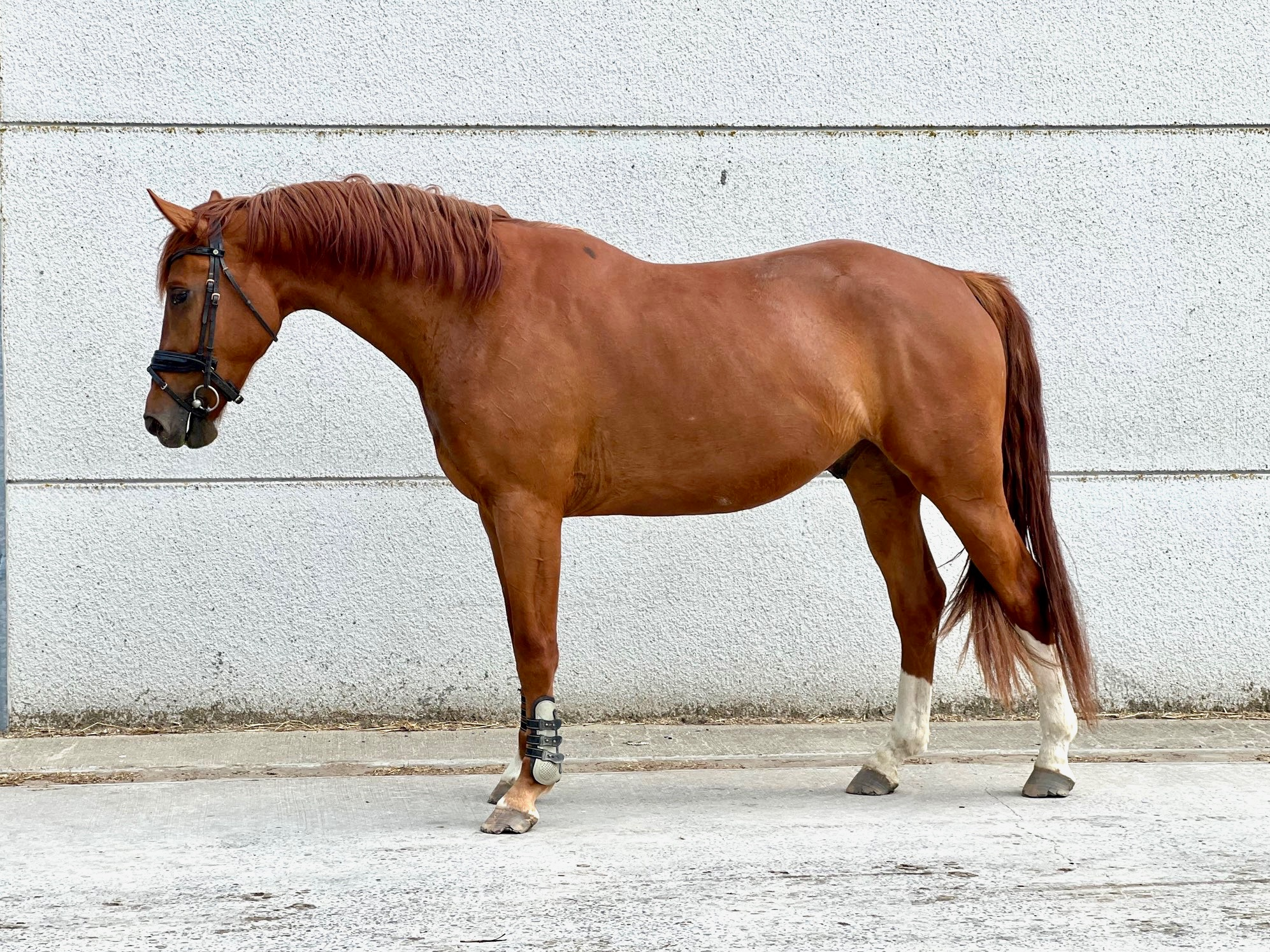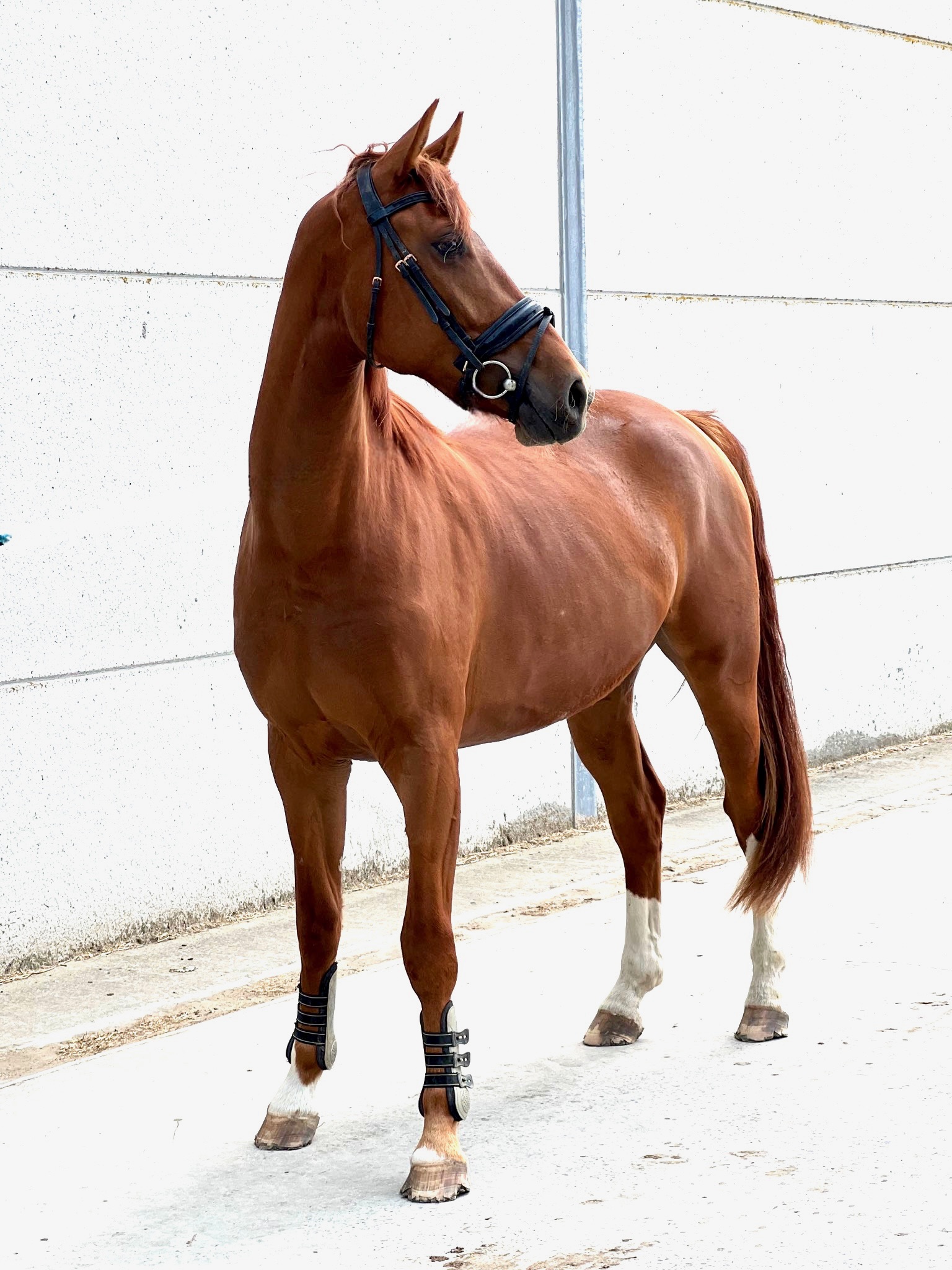 Wasco van de Sparrenhoef is een zoon van de dressuurhengst Hexagon’s Dutch Newman. Zijn moeder is een dochter van de hengst Flemmingh. Wij hebben hem als veulen bij de fokker gekocht. Op driejarige leeftijd zijn we gestart met het zadelmak maken, wat hij zeer goed oppakte. Hij ontwikkelde zich tot een opvallend mooi paard met een stokmaat van 1,71 m. Wasco heeft een fraaie oprichting, een correct fundament en een aansprekend model met een goed gesloten achterhand. Hij beschikt over drie bovengemiddelde basisgangen met een krachtig achterbeen. In beweging toont hij een natuurlijke balans en goed ruggebruik. Hij is klinisch en radiologisch gekeurd op 23-09-2025; het rapport en de foto’s zijn beschikbaar. Op zijn linkerachterbeen heeft hij een litteken dat is ontstaan door een trap op tweejarige leeftijd, waarbij een stukje van het griffelbeentje werd verwijderd. Dit veroorzaakt geen hinder (zie keuringsrapport). Momenteel wordt hij verder getraind op buiging en laat hij zich in alle drie de gangen gemakkelijk rijden. Wasco van de Sparrenhoef is a son of the dressage stallion Hexagon’s Dutch Newman. His dam is by the stallion Flemmingh. We purchased him as a foal directly from the breeder. At the age of three, we started his under-saddle training, which he accepted very well. He has developed into a strikingly beautiful horse standing 1.71 m tall. Wasco shows an elegant uphill frame, correct conformation, and an appealing model with a well-developed hindquarter. He has three above-average gaits with a strong hind leg, moving with natural balance and good use of his back. He was clinically and radiographically examined on 23 September 2025; the report and X-rays are available. He has a small scar on his left hind leg due to a kick he received as a two-year-old, during which a small part of the splint bone was removed. This does not affect him in any way (see veterinary report). He is currently being further trained in suppleness and is easy to ride in all three gaits. Wasco van de Sparrenhoef est un fils de l’étalon de dressage Hexagon’s Dutch Newman. Sa mère est une fille de l’étalon Flemmingh. Nous l’avons acheté poulain chez l’éleveur. À l’âge de trois ans, nous avons commencé son débourrage, qu’il a très bien accepté. Il s’est développé en un cheval remarquable, mesurant 1,71 m. Wasco présente une belle attitude, une conformation correcte et un modèle harmonieux avec une arrière-main bien fermée. Il possède trois allures supérieures à la moyenne, avec une bonne impulsion du postérieur. En mouvement, il montre un bon équilibre naturel et une bonne utilisation du dos. Il a été examiné cliniquement et radiographiquement le 23 septembre 2025 ; le rapport et les photos sont disponibles. Il a une petite cicatrice sur la jambe arrière gauche due à un coup reçu à deux ans, au cours duquel une partie de l’os du canon accessoire a été retirée. Cela ne lui cause aucune gêne (voir rapport vétérinaire). Il poursuit actuellement son entraînement sur la souplesse et se montre facile à monter dans les trois allures. Wasco van de Sparrenhoef ist ein Sohn des Dressurhengstes Hexagon’s Dutch Newman. Seine Mutter stammt vom Hengst Flemmingh ab. Wir haben ihn als Fohlen direkt vom Züchter gekauft. Mit drei Jahren haben wir mit dem Anreiten begonnen, was er sehr gut angenommen hat. Er hat sich zu einem auffallend schönen Pferd mit einem Stockmaß von 1,71 m entwickelt. Wasco zeigt eine elegante Aufrichtung, ein korrektes Fundament und ein harmonisches Gebäude mit einer gut bemuskelten Hinterhand. Er verfügt über drei überdurchschnittliche Grundgangarten mit einem aktiven Hinterbein. In der Bewegung zeigt er natürliche Balance und eine gute Rückentätigkeit. Am 23.09.2025 wurde er klinisch und röntgenologisch untersucht; der Bericht und die Aufnahmen sind verfügbar. Er hat eine kleine Narbe am linken Hinterbein, verursacht durch einen Tritt im zweijährigen Alter, bei dem ein Teil des Griffelbeins entfernt wurde. Dies beeinträchtigt ihn jedoch in keiner Weise (siehe Untersuchungsbericht). Er wird derzeit weiter in der Biegung und Losgelassenheit trainiert und lässt sich in allen drei Grundgangarten leicht reiten.