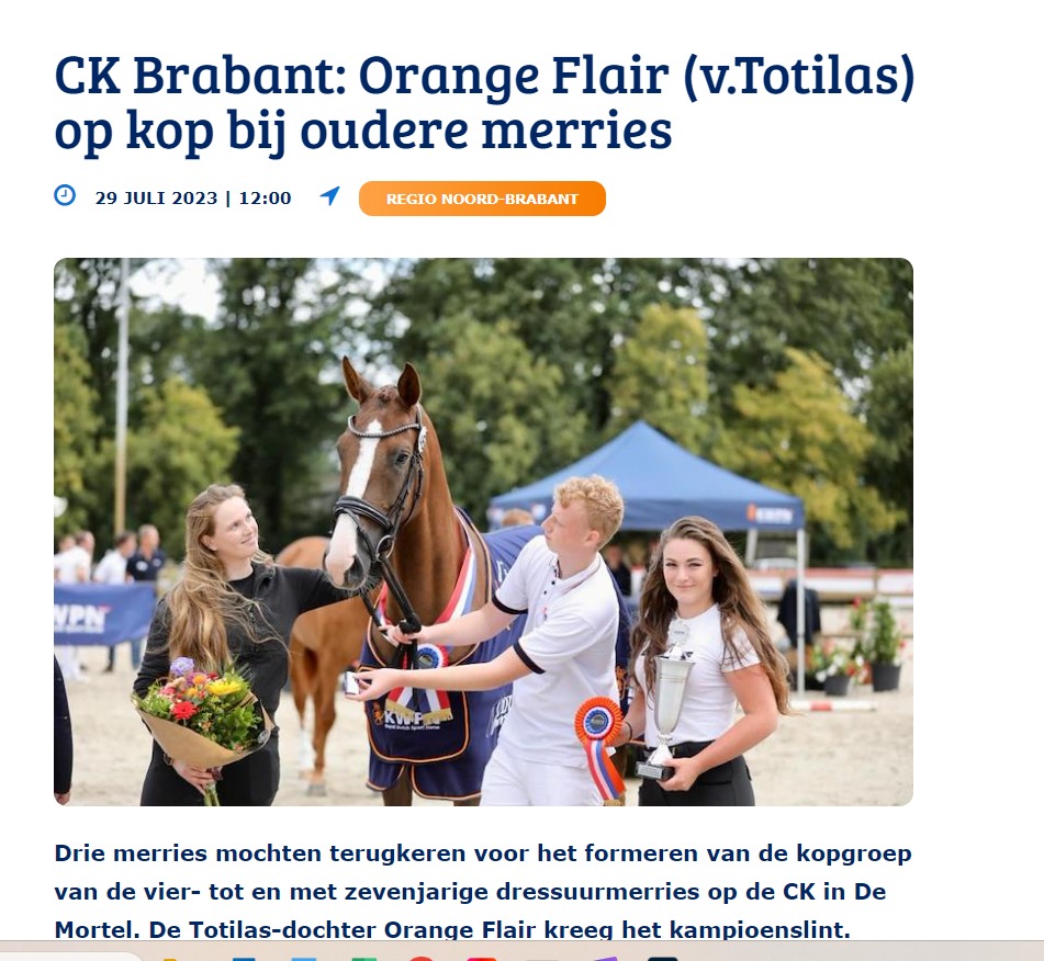 Orange Flair is een prachtige merrie, afkomstig uit de combinatie Totilas x Florencio x Krack C. Ze heeft een harmonieus model met veel formaat en beschikt over drie mooie, luchtige gangen. Ze werd op 3-jarige leeftijd Kampioen in de zuidelijke regio tijdens de KWPN-merriekeuring in Nederland. Ze is zeer prettig in de omgang en erg zacht in de verzorging. Ze kent de stapmolen en gaat elke dag naar de paddock. Ze is op 3-jarige leeftijd ingereden maar heeft weinig gewerkt, waardoor ze nog vrij groen is. Ze kent echter al schouderbinnenwaarts, appuyementen en travers in stap en draf. In galop beheerst ze stap-galop en galop-stap overgangen. Momenteel werken we aan het contra-galop. Ze gaat zowel alleen als in gezelschap op buitenrit. Een veelbelovende merrie voor iemand die de tijd wil nemen om haar correct op te leiden. Orange Flair is a stunning mare from the combination Totilas x Florencio x Krack C. She has a harmonious conformation with good height and three lovely, airy gaits. At 3 years old, she was Champion in the southern region during the KWPN mare classification in the Netherlands. She is very pleasant to handle and extremely gentle in her daily care. She is familiar with the walker and goes to the paddock every day. She was started under saddle as a 3-year-old but did very little work during her first years, so she is still quite green. However, she already knows shoulder-in, leg yields, and haunches-in at walk and trot. In canter, she can perform walk–canter and canter–walk transitions, and we are currently working on counter-canter. She hacks out both alone and in company. A promising mare for someone willing to take the time to develop her correctly. Orange Flair est une magnifique jument issue de l'accouplement entre Totilas x Florencio x Krack C. Elle a un modèle harmonieux avec de la taille et possède 3 jolies allures aériennes. Elle a été Championne à 3 ans dans la région sud lors du classement des juments KWPN en Hollande. Elle est très agréable à manipuler et très douce aux soins. Elle connaît le marcheur et va tous les jours au paddock. Elle a été débourrée à l’âge de trois ans, mais a très peu travaillé durant ses premières années, ce qui fait qu’elle est encore assez verte. Cependant, elle connaît déjà l’épaule en dedans, les cessions à la jambe et le travers au pas et au trot. Au galop, elle sait faire les pas-galop/galop-pas. Nous travaillons actuellement sur le contre galop. Elle part en balade seule ou accompagnée. Une jument prometteuse pour qui saura prendre le temps de la former. Orange Flair ist eine wunderschöne Stute aus der Anpaarung Totilas x Florencio x Krack C. Sie hat ein harmonisches Exterieur mit viel Größe und verfügt über drei schöne, leichtfüßige Grundgangarten. Mit 3 Jahren wurde sie Champion in der südlichen Region bei der KWPN-Stuteneintragung in den Niederlanden. Sie ist sehr angenehm im Umgang und ausgesprochen sanft in der Pflege. Sie kennt die Führanlage und geht täglich auf die Weide/Paddock. Sie wurde im Alter von drei Jahren angeritten, hat in den ersten Jahren jedoch nur wenig gearbeitet, weshalb sie noch recht grün ist. Dennoch beherrscht sie bereits Schulterherein, Schenkelweichen und Travers im Schritt und Trab. Im Galopp kann sie Schritt-Galopp und Galopp-Schritt Übergänge. Zurzeit arbeiten wir am Kontergalopp. Sie geht alleine oder in Begleitung ins Gelände. Eine vielversprechende Stute für jemanden, die/der sich die Zeit nimmt, sie sorgfältig auszubilden.