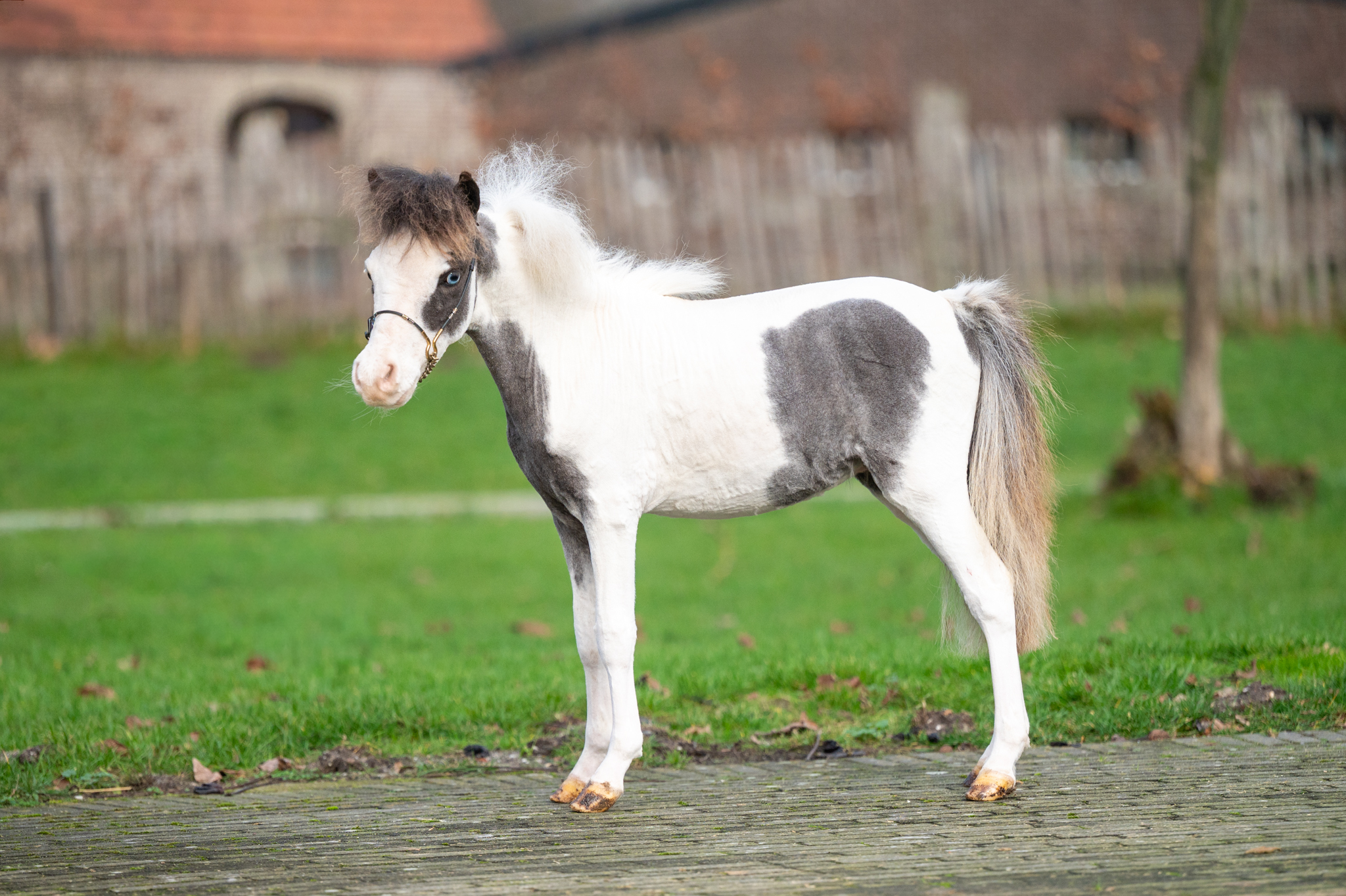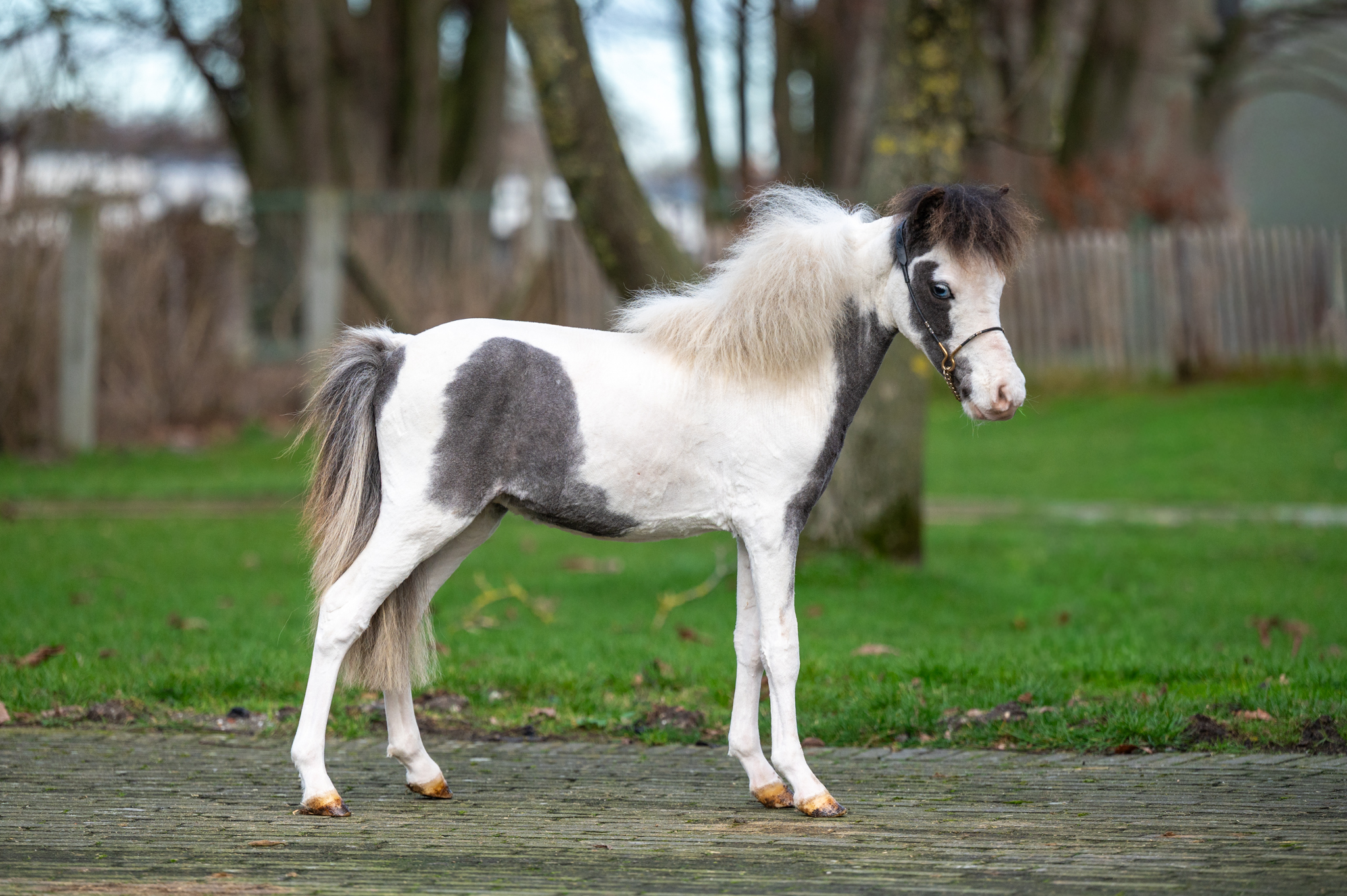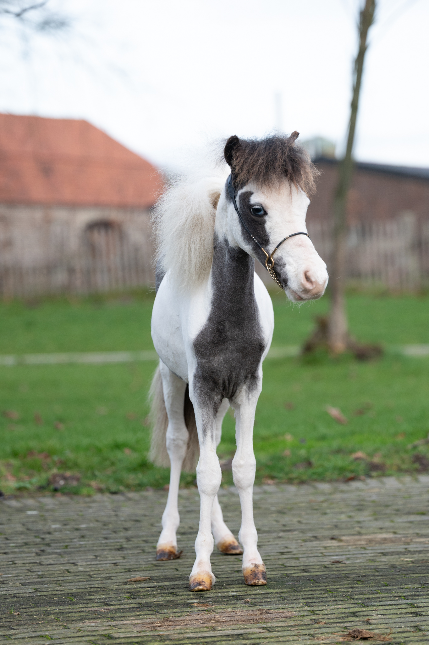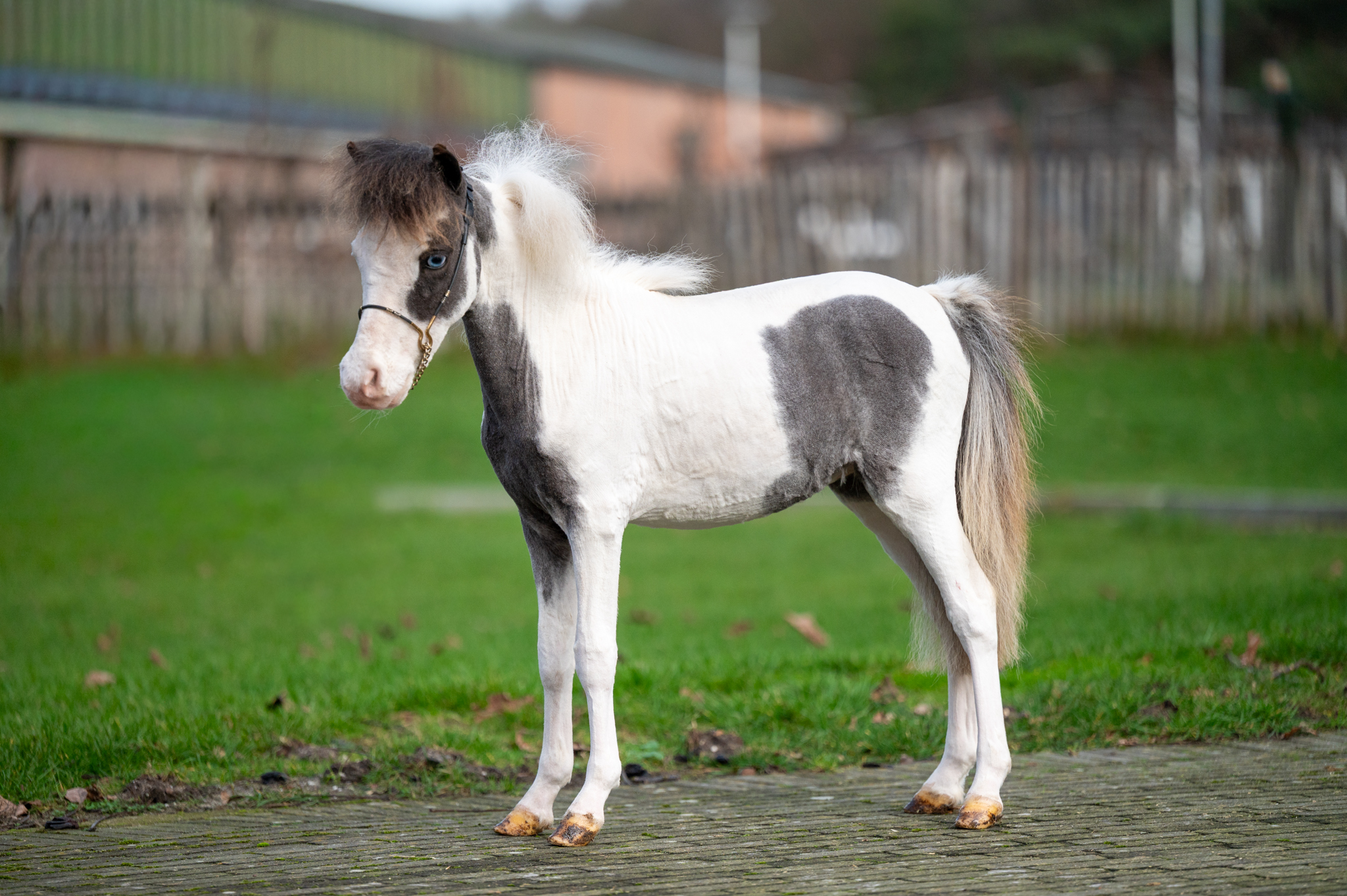 Toby van het Houbenhof is geboren op 20-05-2025 en is een zeer kleine overo zwartbonte hengst van 74 cm. Hij stamt af van de Nederlandse Kampioen Mini-maat hengst D&D’s Picasso. De moeder is een zilveren bruinbonte merrie, afstammend van een zilveren dapple pinto hengst en een palomino bonte moeder. Toby is kwaliteitsvol gefokt en heeft het potentieel om in de fokkerij diverse kleuren door te geven. Toby van het Houbenhof was born on 20-05-2025 and is a very small overo black-and-white stallion, measuring 74 cm. He is descended from the Dutch Champion Miniature Stallion D&D’s Picasso. His dam is a silver brown-and-white mare, descending from a silver dapple pinto stallion and a palomino pinto dam. Toby is bred with quality and has the potential to pass on a variety of colors in breeding. Toby van het Houbenhof est né le 20-05-2025 et est un très petit étalon overo noir et blanc, mesurant 74 cm. Il est issu du champion néerlandais des étalons miniatures, D&D’s Picasso. Sa mère est une jument alezane et blanche argentée, descendante d’un étalon silver dapple pinto et d’une mère palomino pie. Toby est élevé avec soin et a le potentiel de transmettre diverses couleurs dans l’élevage. Toby van het Houbenhof wurde am 20.05.2025 geboren und ist ein sehr kleiner overo schwarz-weißer Hengst von 74 cm. Er stammt von dem niederländischen Miniatur-Hengstmeister D&D’s Picasso ab. Die Mutter ist eine silberbraun-weiße Stute, abstammend von einem silbernen Dapple Pinto Hengst und einer palomino gescheckten Mutter. Toby ist qualitativ gezüchtet und hat das Potenzial, in der Zucht verschiedene Farben weiterzugeben.