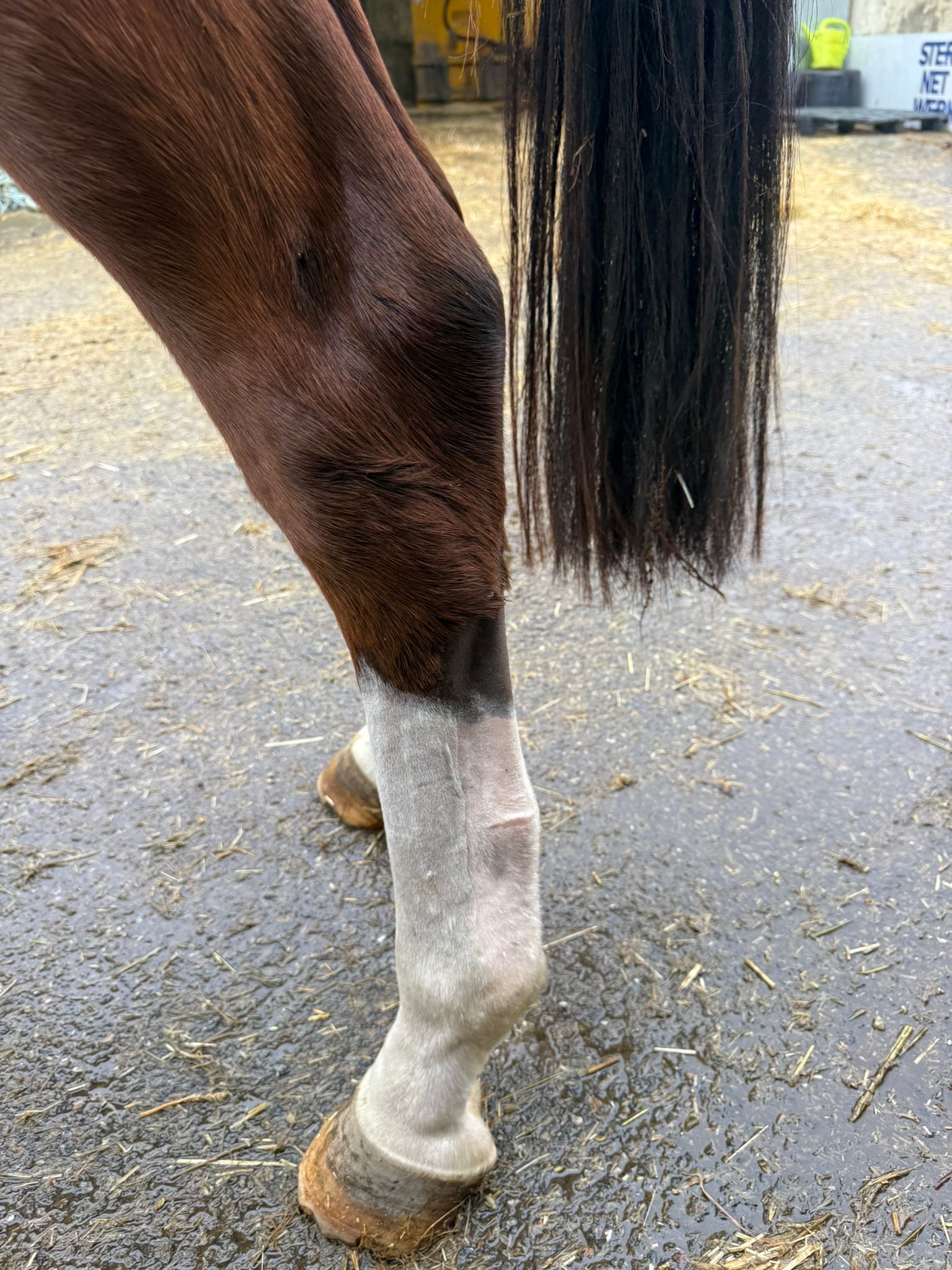 Different: Opmerking pees linksachter (geen garantie op dat onderdeel)/ Remark: tendon left hind leg (no warranty on this part)/ Remarque : tendon postérieur gauche (aucune garantie sur cette partie)/ Hinweis: Sehne hinten links (keine Gewährleistung auf diesen Bereich).