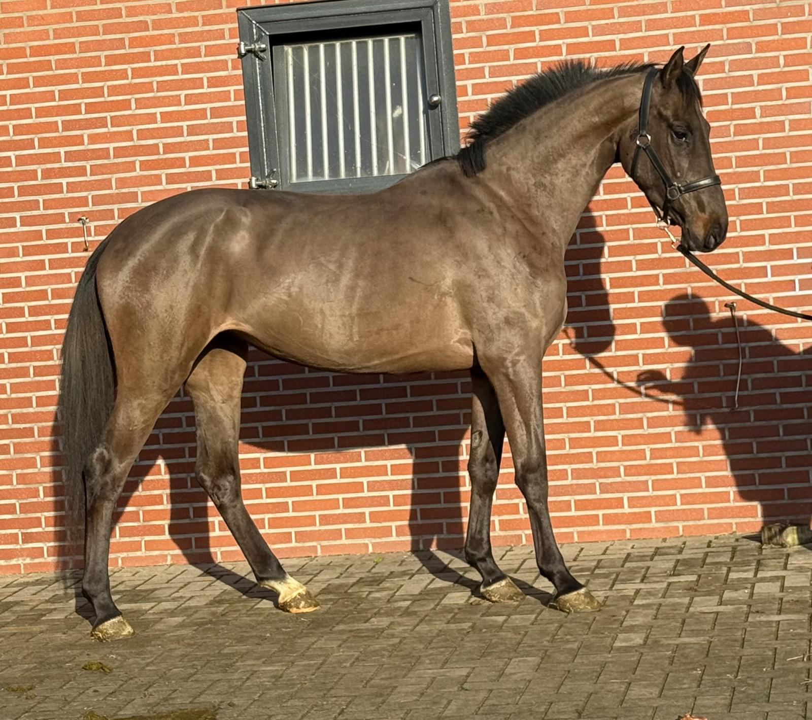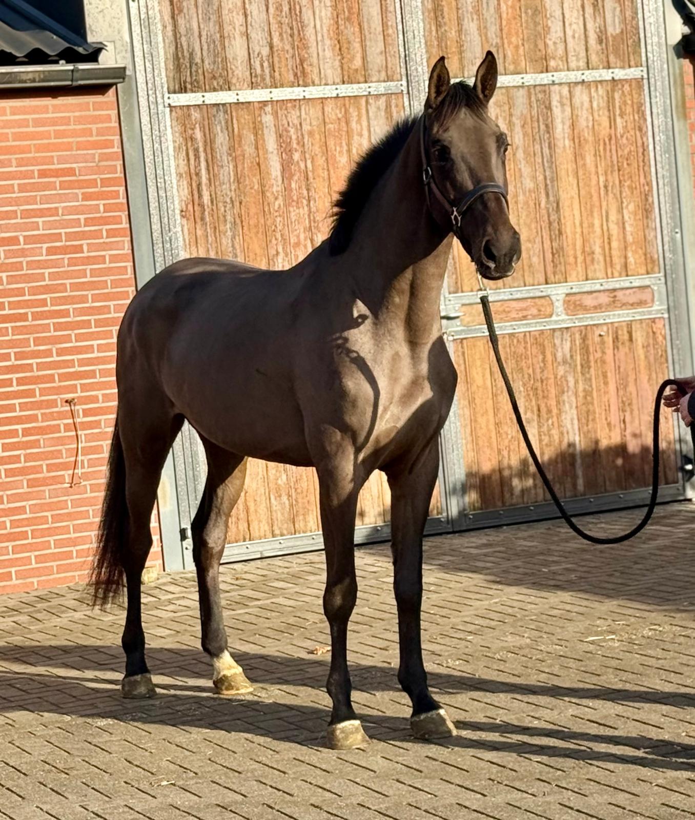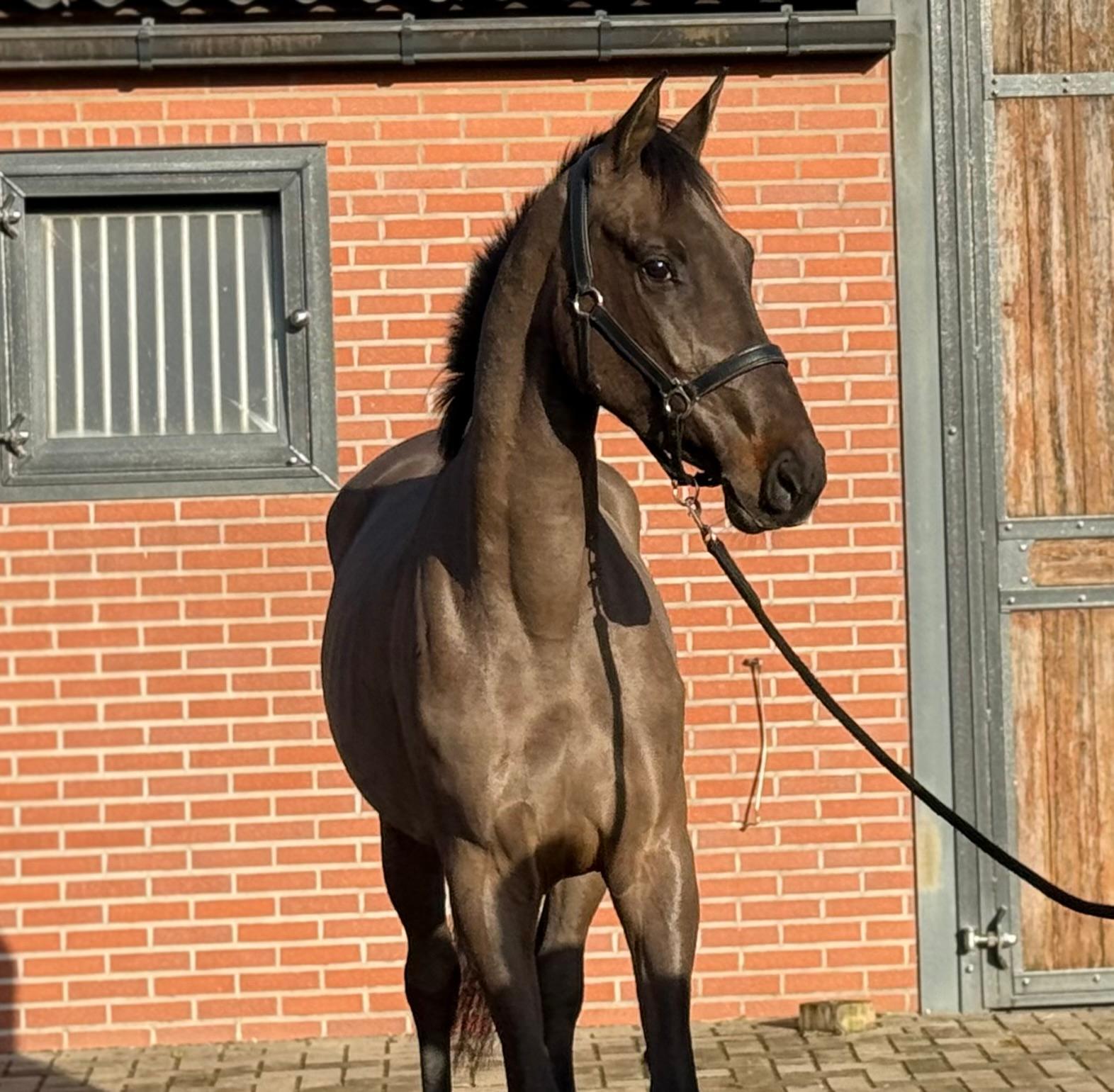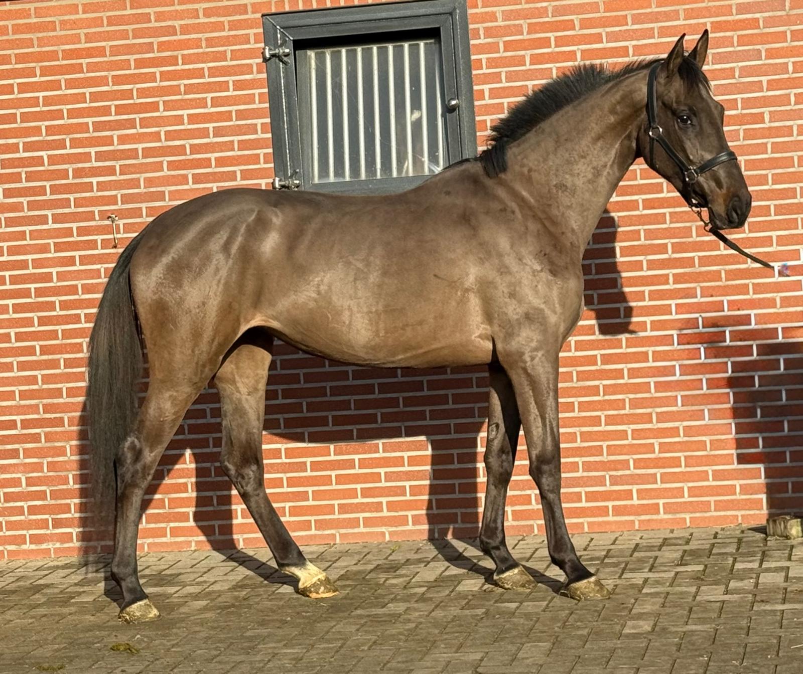 Sarona JK; the beauty and the brains ..! Sarona is een prachtige verschijning om te zien. Deze 4jarige merrie heeft een mooi silhouet en een aansprekend model. Sarona is gefokt uit de sterke ‘Barona’ lijn. Haar vader is de internationale springhengst Zannini die afstamt van de bekende holsteiner hengst CASSINI II uit een Grandeur moeder. Moedersvader is de trakhener hengst Symont die afstamt van de Grand Prix hengst Monteverdi (Partout) uit een Kostolany moeder. Kostolany kennen we o.a. als vader van Gribaldi. Grootmoeder Jarona stamt af van de gelderse hengst Floris bs (v.Negro). Deze hengst was zelf succesvol actief op INTER II niveau dressuur. Wat haar afstamming al doet vermoeden, is Sarona een paard met allround mogelijkheden. Ze beweegt gemakkelijk en lichtvoetig. In galop heeft ze een goede balans en ze wisselt gemakkelijk. Op de sprong toont ze snelle reflexen en is ze voorzichtig. Daarbij laat een mooie techniek zien waarbij ze achter telkens de sprong goed afmaakt. Deze merrie komt ongeveer 2 maand geleden rechtstreeks van de fokker uit de opfok groep. Tot op heden is ze dan ook nog onbeleerd. Dus nog geheel naar eigen hand te zetten. Wel is ze rustig op stal en eerlijk in omgang. Grijp nu uw kans om in het bezit te komen van deze fraaie en talentvolle merrie. Sarona JK; the beauty and the brains..! Sarona is a beautiful sight to behold. This 4-year-old mare has an elegant silhouette and an appealing model. Sarona is bred from the strong ‘Barona’ line. Her sire is the international showjumping stallion Zannini, descended from the well-known Holsteiner stallion Cassini II out of a Grandeur mare. Her damsire is the Trakehner stallion Symont, descending from the Grand Prix stallion Monteverdi (Partout) out of a Kostolany mare. Kostolany is also known, among others, as the sire of Gribaldi. Granddam Jarona descends from the Gelderlander stallion Floris BS (by Negro). This stallion himself competed successfully at INTER II dressage level. As her pedigree already suggests, Sarona is a horse with all-round potential. She moves easily and light-footed. In canter she has good balance and changes leads easily. Over fences she shows quick reflexes and is careful. She also demonstrates a nice technique, finishing the jump well behind every time. This mare came directly from the breeder about two months ago, straight from the youngstock group. Up to now she has therefore not yet been trained, giving you the opportunity to develop her entirely your own way. She is calm in the stable and honest to handle. Take your chance now to acquire this beautiful and talented mare. Sarona JK ; la beauté et l’intelligence..! Sarona est une apparition magnifique. Cette jument de 4 ans possède une belle silhouette et un modèle très harmonieux. Sarona est issue de la solide lignée « Barona ». Son père est l’étalon international de saut d’obstacles Zannini, descendant du célèbre étalon Holsteiner Cassini II, issu d’une mère par Grandeur. Le père de mère est l’étalon Trakehner Symont, descendant de l’étalon de Grand Prix Monteverdi (Partout) et d’une mère par Kostolany. Kostolany est notamment connu comme le père de Gribaldi. La grand-mère Jarona descend de l’étalon Gelderlander Floris BS (par Negro), lui-même performant avec succès au niveau INTER II en dressage. Comme son pedigree le laisse déjà supposer, Sarona est un cheval aux possibilités polyvalentes. Elle se déplace avec facilité et légèreté. Au galop, elle possède un bon équilibre et effectue les changements facilement. À l’obstacle, elle montre des réflexes rapides et beaucoup de prudence. Elle présente également une belle technique, terminant toujours bien son saut avec les postérieurs. Cette jument est arrivée directement de l’éleveur il y a environ deux mois, tout droit du groupe d’élevage. Jusqu’à présent, elle n’a donc pas encore été débourrée, ce qui vous permet de la former entièrement à votre manière. Elle est calme à l’écurie et honnête dans la manipulation. Saisissez dès maintenant l’occasion de devenir propriétaire de cette jument élégante et talentueuse. Sarona JK; Schönheit und Köpfchen..! Sarona ist eine wunderschöne Erscheinung. Diese 4-jährige Stute verfügt über eine elegante Silhouette und ein ansprechendes Modell. Sarona stammt aus der starken „Barona“-Linie. Ihr Vater ist der internationale Springhengst Zannini, abstammend vom bekannten Holsteiner Hengst Cassini II aus einer Grandeur-Mutter. Der Muttervater ist der Trakehner Hengst Symont, abstammend vom Grand-Prix-Hengst Monteverdi (Partout) aus einer Kostolany-Mutter. Kostolany ist unter anderem auch als Vater von Gribaldi bekannt. Großmutter Jarona stammt vom Gelderländer Hengst Floris BS (v. Negro) ab. Dieser Hengst war selbst erfolgreich bis zum Dressurniveau INTER II aktiv. Wie ihre Abstammung bereits vermuten lässt, ist Sarona ein Pferd mit vielseitigen Möglichkeiten. Sie bewegt sich leicht und mit viel Elastizität. Im Galopp hat sie eine gute Balance und wechselt die Galoppsprünge leicht. Am Sprung zeigt sie schnelle Reflexe und ist vorsichtig. Dabei zeigt sie eine schöne Technik und beendet den Sprung jedes Mal gut mit der Hinterhand. Diese Stute kam vor etwa zwei Monaten direkt vom Züchter aus der Aufzuchtgruppe. Bis heute ist sie daher noch ungeritten und kann ganz nach Ihren eigenen Vorstellungen ausgebildet werden. Im Stall ist sie ruhig und im Umgang ehrlich. Nutzen Sie jetzt Ihre Chance, diese elegante und talentierte Stute zu erwerben.