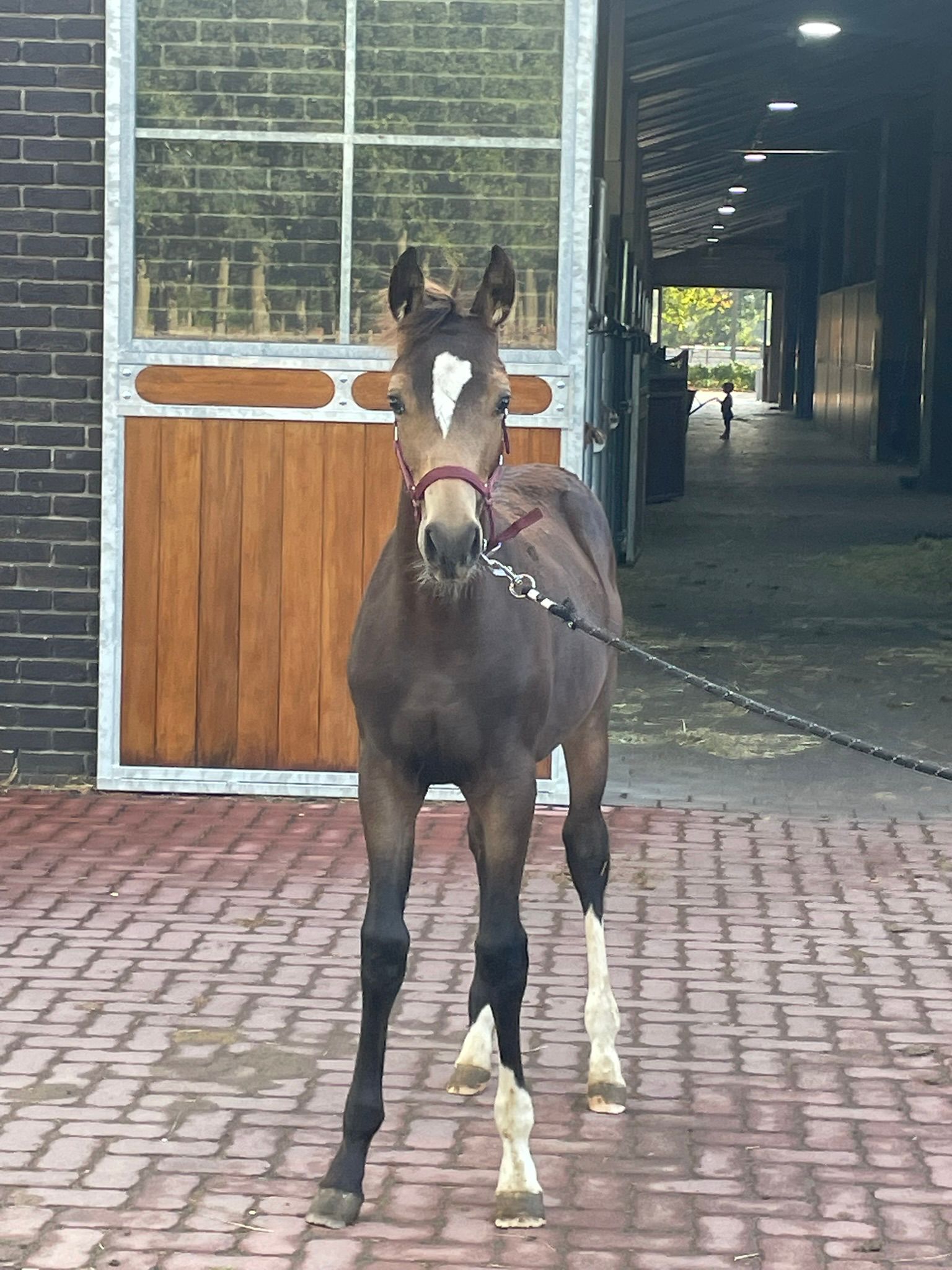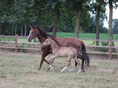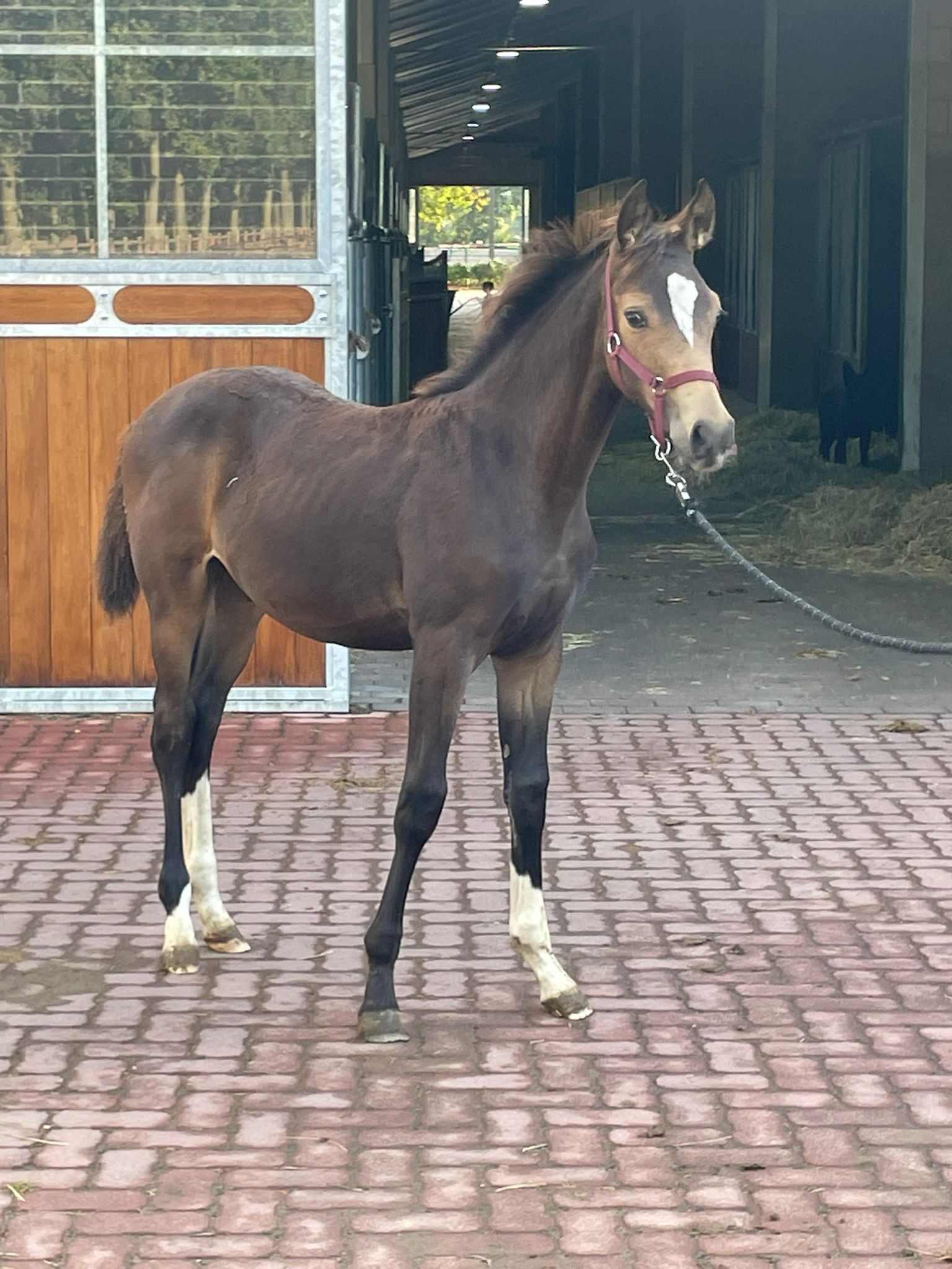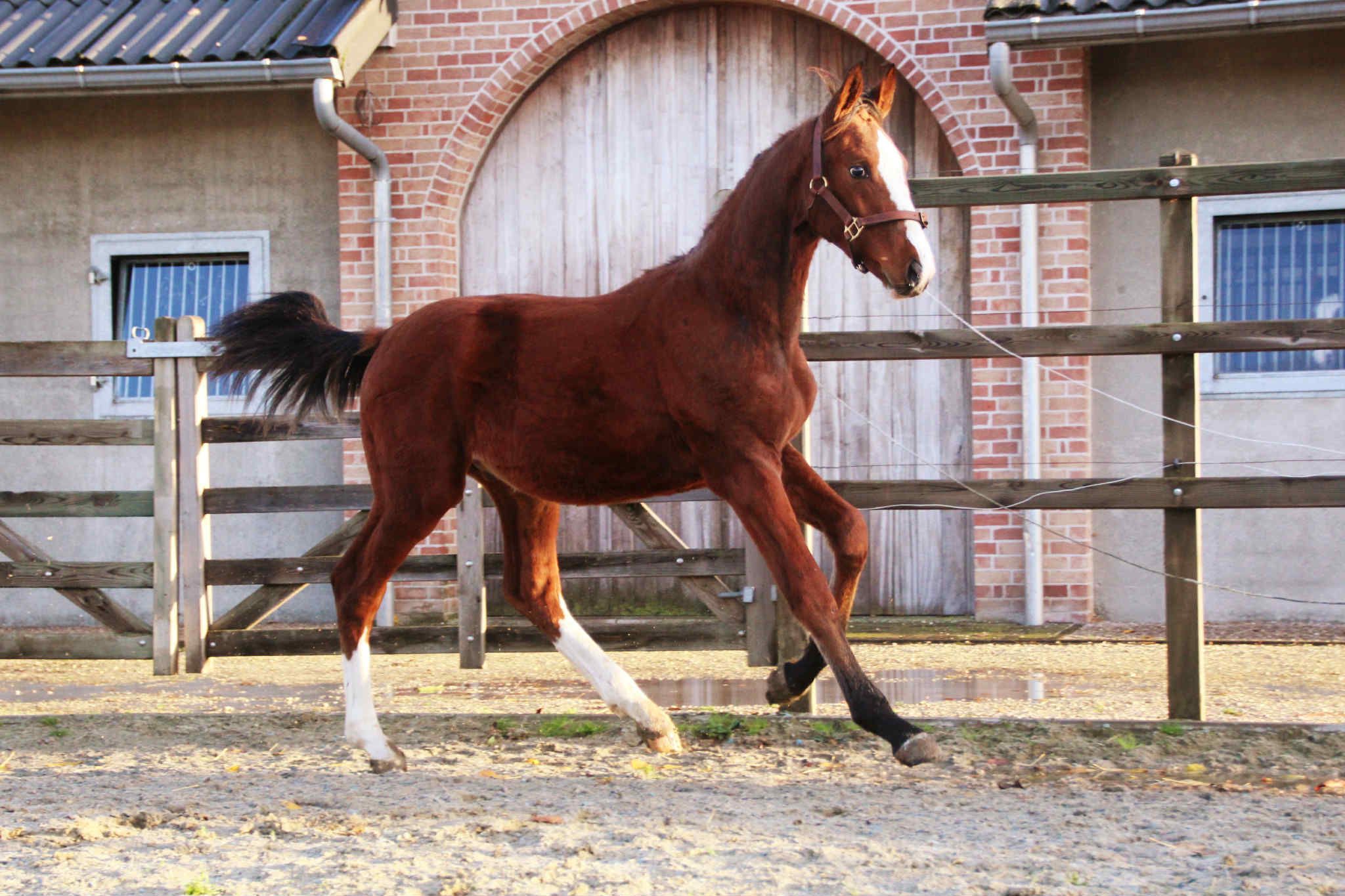 César van het Waterblok – 2025 hengstveulen uit Unicum van de Donkhoeve x Sanne van het Waterblok César van het Waterblok is een veelbelovend BWP-hengstveulen met uitstraling, een sterk fundament en drie correcte, soepele basisgangen. Hij combineert in zijn pedigree bewezen springbloed met moderne sportaanleg. Vader: Unicum van de Donkhoeve – een hengst die bekendstaat om zijn kracht, instelling en vermogen. Hij vererft deze kwaliteiten consequent aan zijn nakomelingen, die uitblinken in jonge paardenproeven en op hoger niveau. Moeder: Sanne van het Waterblok – een betrouwbare merrie die al meerdere correcte, werkwillige nakomelingen heeft gebracht. Ze stamt uit een prestatiegerichte moederlijn waarin sport en kwaliteit diep verankerd zijn. César toont nu al veel balans, een sterke achterhand en een natuurlijke galop met gedragenheid. Hij beweegt met souplesse en laat zich gemakkelijk hanteren. Het veulen is inmiddels enkele weken gespeend en gaat uitstekend aan de hand. César van het Waterblok – een hengstveulen met potentieel, uitstraling en een bloedlijn om van te dromen. César van het Waterblok – 2025 colt by Unicum van de Donkhoeve x Sanne van het Waterblok César van het Waterblok is a highly promising BWP colt with presence, a strong foundation, and three correct, supple basic gaits. His pedigree combines proven jumping blood with modern sport qualities. Sire: Unicum van de Donkhoeve – renowned for his power, attitude, and scope. He consistently passes these traits on to his offspring, who excel in young horse classes and at higher levels of competition. Dam: Sanne van het Waterblok – a reliable mare who has already produced several correct and willing foals. She descends from a performance-oriented dam line rich in sport genetics. César already shows excellent balance, a strong hind leg, and a naturally uphill, collected canter. He moves with suppleness and is easy to handle. Recently weaned, he is well-behaved and confident in hand. César van het Waterblok – a foal with potential, charisma, and a dream pedigree for the future. César van het Waterblok – Poulain mâle 2025 par Unicum van de Donkhoeve et Sanne van het Waterblok César van het Waterblok est un poulain BWP très prometteur, doté d’une belle allure, d’une ossature solide et de trois allures correctes et souples. Il réunit dans son pedigree du sang de saut d’obstacles éprouvé et un type sportif moderne. Père : Unicum van de Donkhoeve – célèbre pour sa puissance, sa mentalité et sa capacité, des qualités qu’il transmet régulièrement à sa descendance, performante aussi bien dans les épreuves de jeunes chevaux qu’à plus haut niveau. Mère : Sanne van het Waterblok – une jument fiable ayant déjà produit plusieurs poulains corrects et appliqués. Elle descend d’une lignée maternelle axée sur la performance, où le sport est inscrit dans les gènes. César montre déjà beaucoup d’équilibre, un arrière-main puissant et un galop naturel, ample et montant. Il se déplace avec souplesse et se montre facile à manipuler. Sevré depuis quelques semaines, il est très sage et confiant à la main. César van het Waterblok – un poulain au grand potentiel, plein de charme et issu d’une lignée de rêve. César van het Waterblok – Hengstfohlen 2025 von Unicum van de Donkhoeve x Sanne van het Waterblok César van het Waterblok ist ein äußerst vielversprechendes BWP-Hengstfohlen mit Ausstrahlung, solidem Fundament und drei korrekten, geschmeidigen Grundgangarten. Sein Pedigree vereint bewährtes Springblut mit modernen Sportgenen. Vater: Unicum van de Donkhoeve – bekannt für seine Kraft, Leistungsbereitschaft und sein Vermögen. Diese Eigenschaften vererbt er konsequent an seine Nachkommen, die sich sowohl in Jungpferdeprüfungen als auch auf höherem Niveau auszeichnen. Mutter: Sanne van het Waterblok – eine verlässliche Stute, die bereits mehrere korrekte, arbeitswillige Nachkommen hervorgebracht hat. Sie entstammt einer leistungsorientierten Mutterlinie mit starkem Sporthintergrund. César zeigt bereits jetzt viel Gleichgewicht, eine kräftige Hinterhand und einen natürlichen, bergauf gesprungenen Galopp. Er bewegt sich elastisch und lässt sich leicht im Umgang führen. César van het Waterblok – ein Fohlen mit großem Potenzial, Ausstrahlung und einer Traumabstammung für die Zukunft.